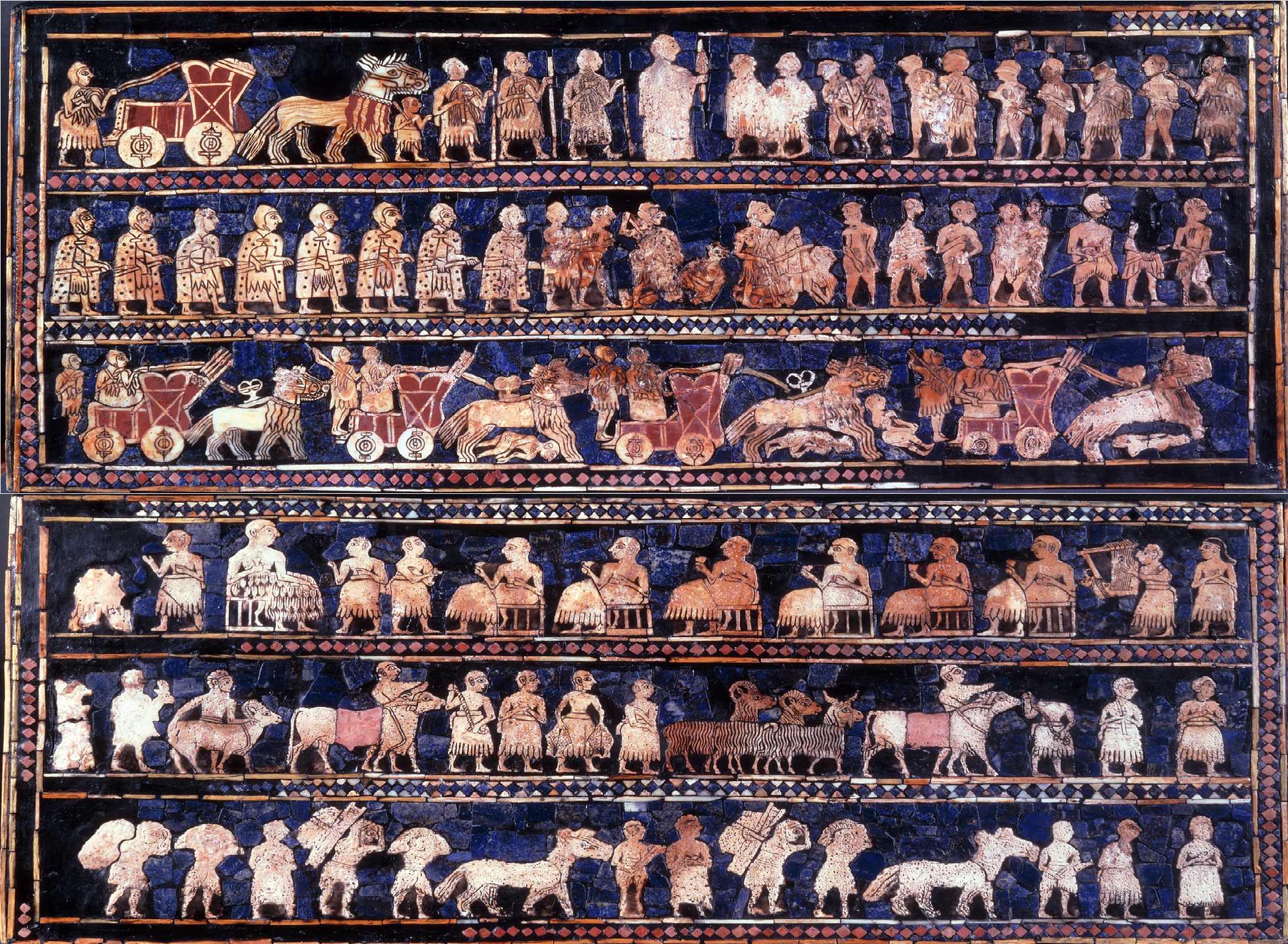 Важнейший источник по шумерской армии, одежде и музыке. Показывает колесницы, пехоту, пленных и царский пир.
